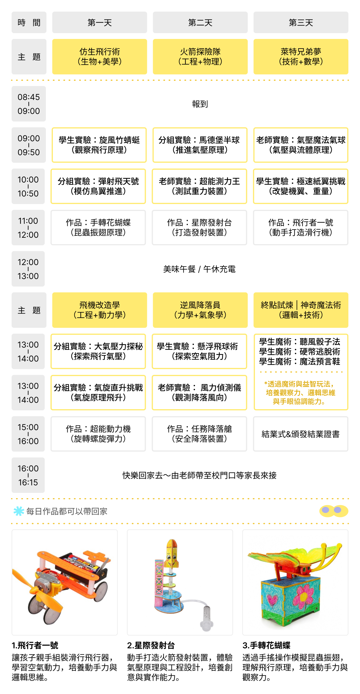 在《萊特兄弟 STEAM 科學營》中,孩子們將化身小小飛行夢想家,從旋風竹蜻蜓、超能動力機、星際發射台到飛行者一號,天天動手實作、天天有新挑戰!