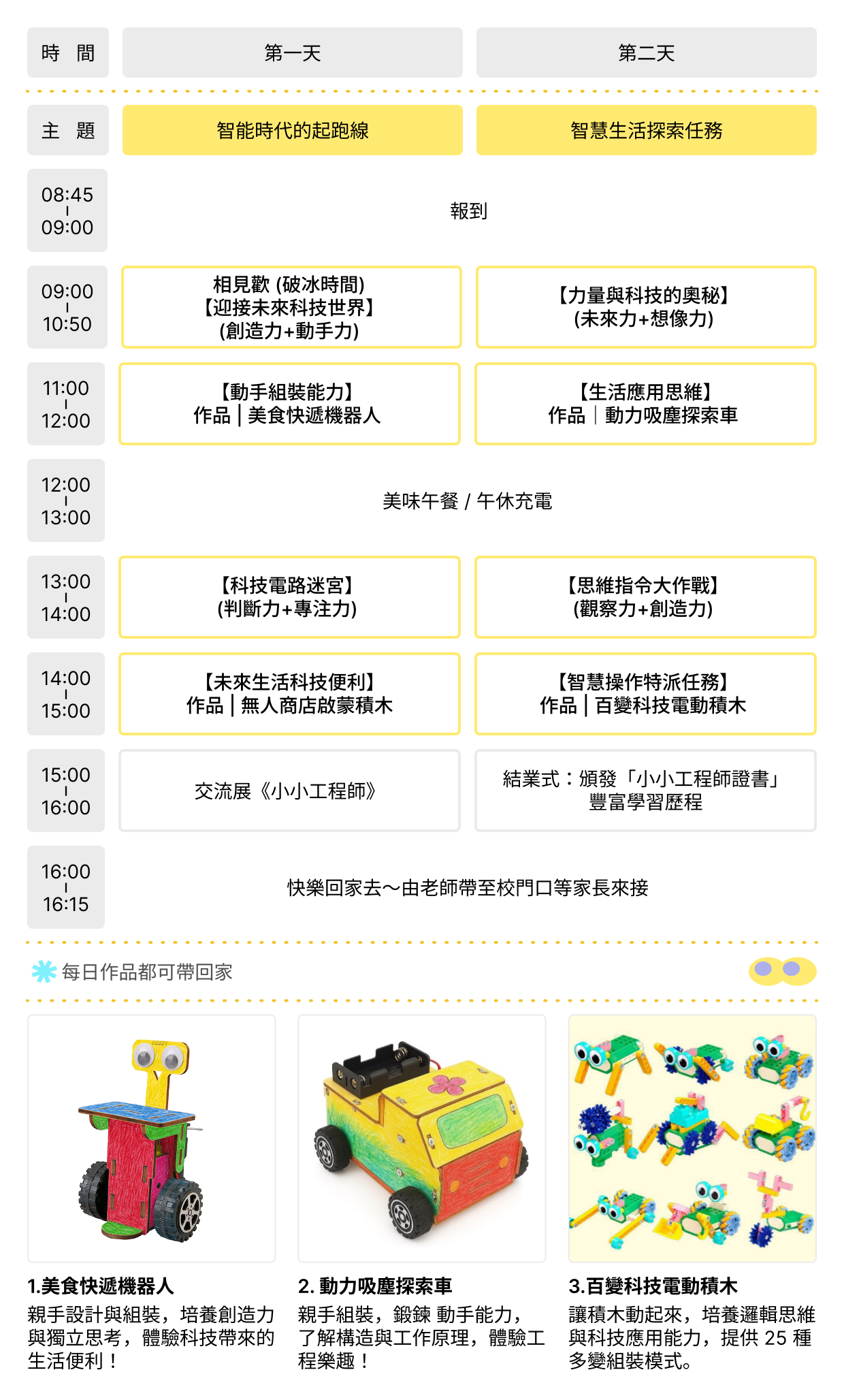 課程融合 STEAM 教育理念 與 科技創新思維,透過創意設計與工程挑戰,讓孩子從「玩中學、學中創」,每天完成專屬作品,培養動手能力、邏輯思維與創造力。
